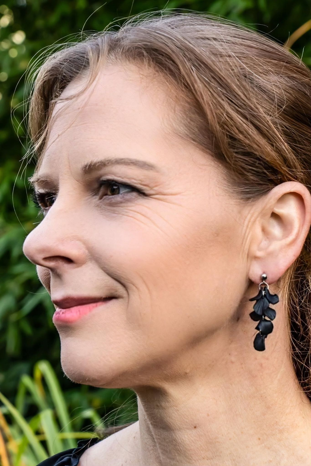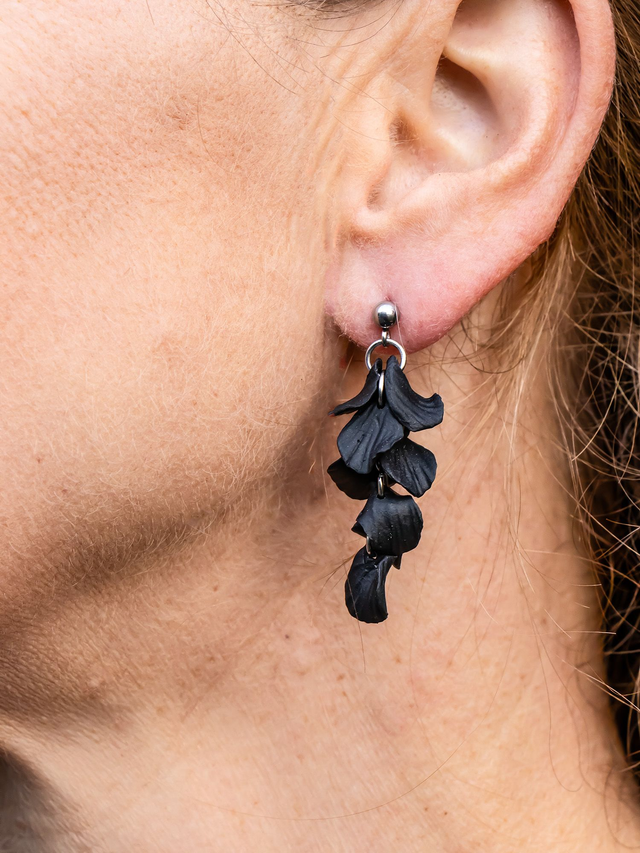 Die schwarzen Blütenohrringe mit Rosenblättern aus Polymerton sind handgearbeitet in meiner kleinen Manufaktur nahe dem bayerischen Augsburg. Jedes zarte Blütenblatt ist einzigartig. Die filigranen Ohrringe sind das perfekte Statement-Accessoire für den Alltag, passen aber genauso gut zu Party- und Abendgarderobe. Die Ohrringe sind federleicht, so können sie den ganzen Tag getragen werden, ohne zu schwer zu werden.