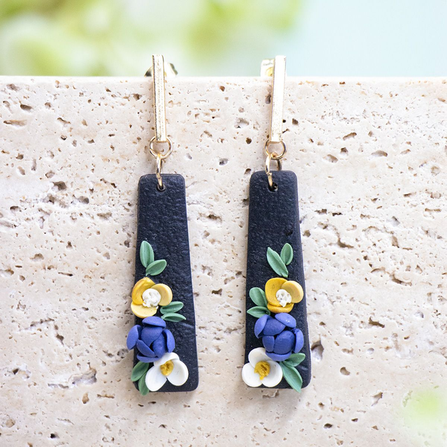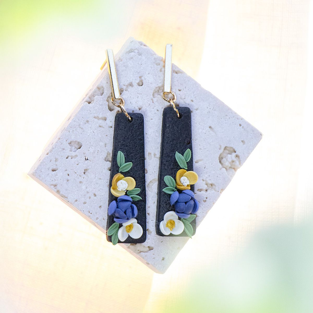 Diese handgemachten Statement-Ohrringe vereinen zarte Blüten in blau, weiß und gelb mit frischem Grün - liebevoll von hand modelliert aus Polymerton. Die floralen Details sitzen auf einem eleganten schwarzen Tropfen-Anhänger und werden durch 18K vergoldete Stecker aus Edelstahl stilvoll ergänzt. Jeder Ohrring wiegt nur 2,5 g - leicht zu tragen, aber garantiert ein Hingucker - perfekt für Alltag, Hochzeit oder besondere Momente.
