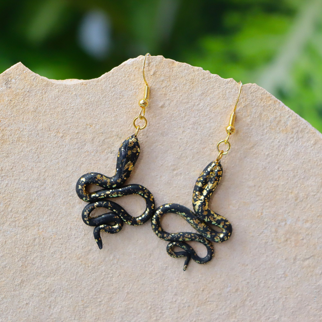 Die Schlange ist ein glücksverheißendes Tier in Japan. Die Schlangen-Ohrhänger sind liebevoll von Hand aus Polymerton gefertigt und mit gold- bzw. silberfarbenem Blattmetall verziert. Jeder Ohrring wird von Hand in unserer kleinen Manufaktur nahe dem bayerischen Augsburg gefertigt und ist ein einzigartiges Unikat.