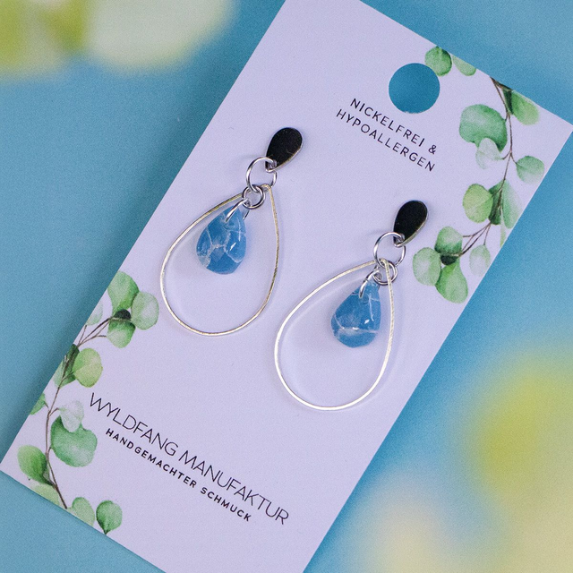 Diese minimalistischen Ohringe in Tränenform sind liebevoll von Hand aus Polymerton gefertigt. Sie zeigen ein eindrucksvolles Mormor-Muster aus türkisgrün und silber. Die zarten Metallrahmen und die einzigartigen blauen Steinperlen aus Polymerton verbinden modernes Design mit liebevoller Handarbeit. Jeder Ohrring wird von Hand in unserer kleinen Manufaktur nahe dem bayerischen Augsburg gefertigt und ist ein einzigartiges Unikat.