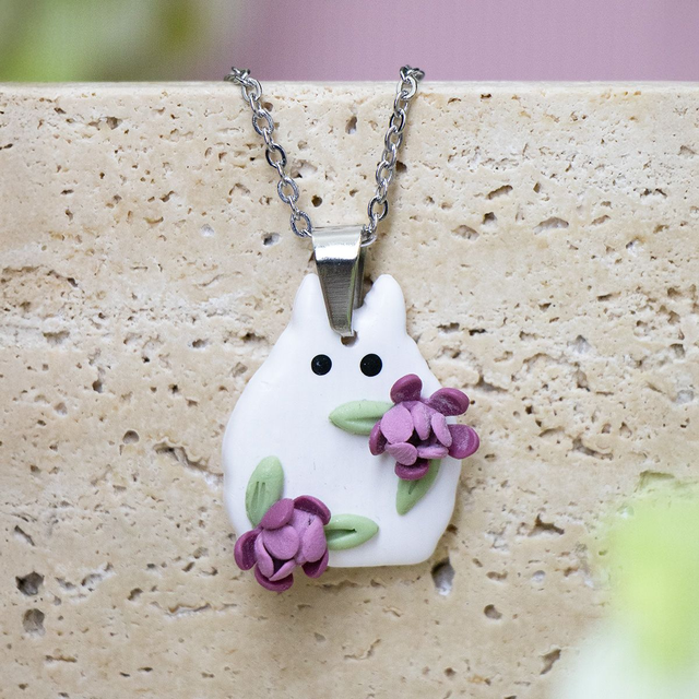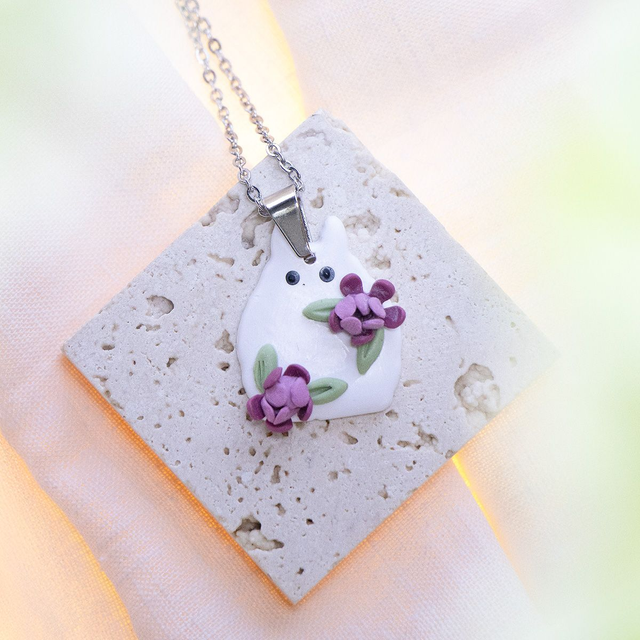 Diese handgemachte weiße Waldgeist-Kette wurde von japanischen Animes inspiriert. Die blauen Geister zeigen liebevolle Details und zarten rosa Blüten. Leicht, verspielt und perfekt für alle, die Natur, Fantasie und handgefertigten Schmuck lieben.